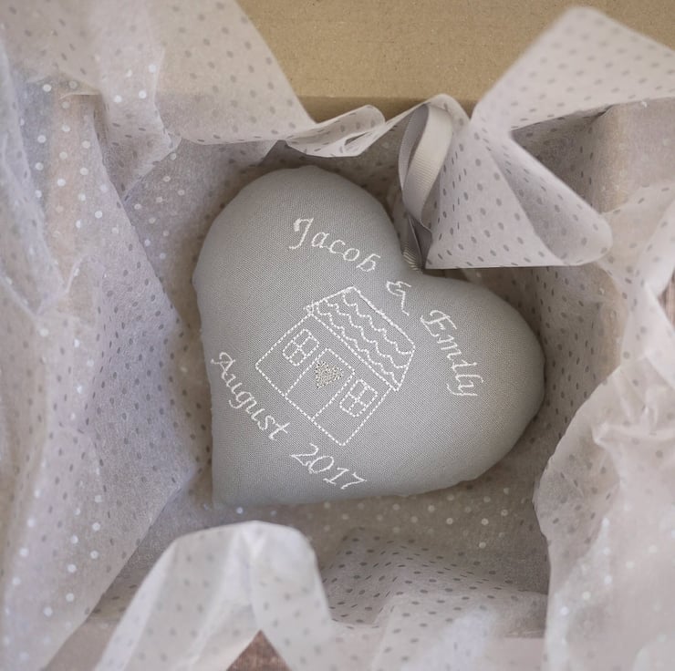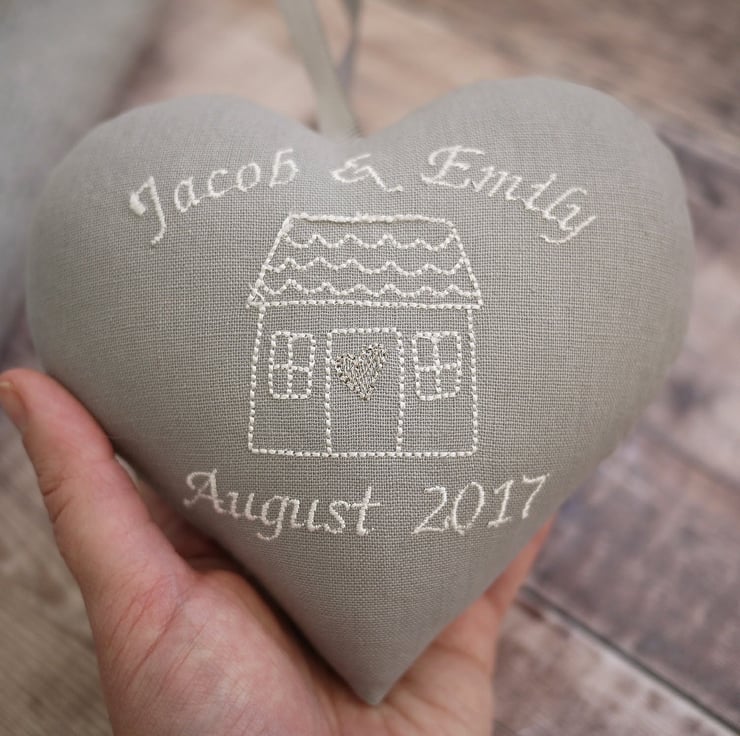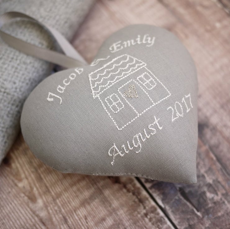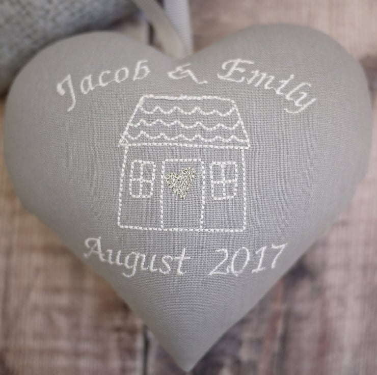 A gorgeous grey fabric personalised heart embroidered with a pretty house design and the names and date of your choice in white thread. Finished with a grey hanging ribbon and gorgeous silver heart in the centre. This is a perfect house warming gift for a special couple or family to celebrate their new home.