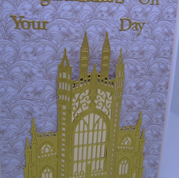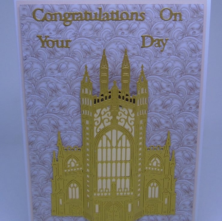 I have made this card from white 220 gsm in weight card, I matt and layered in peach card and then used Maja Designer paper from Sweden, I am so pleased I can bring this designer paper to you, I then cut the Abbey out and lined it with gold Miri card to give that beautiful finish, I have also cut out the sentiment that is at the top of the card in gold as well, this card comes with a envelope and is blank inside for your message. I will send this card out first class by royal mail.