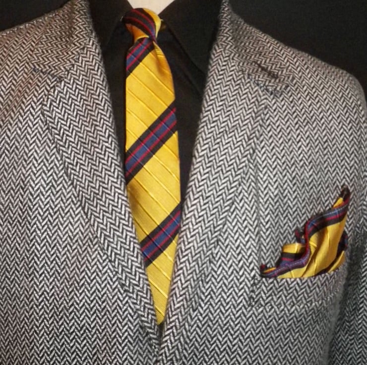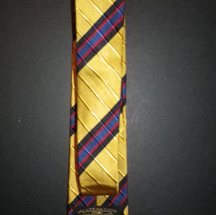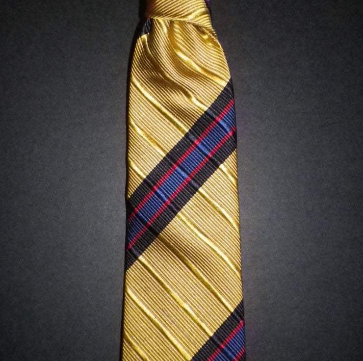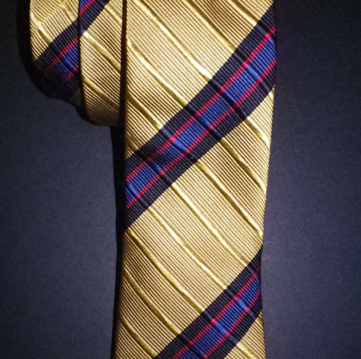 Vintage woven English silk skinny tie ( 2" blade ), rich gold weave with striking navy stripe....