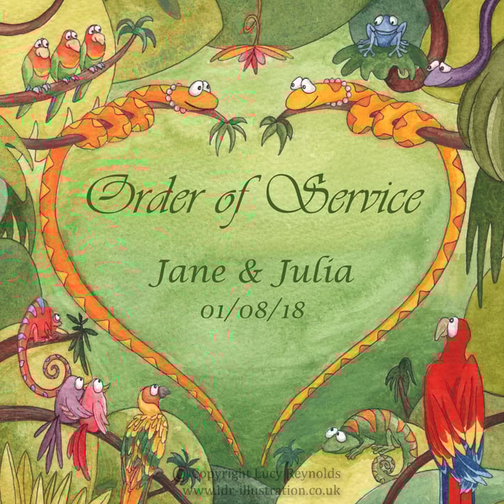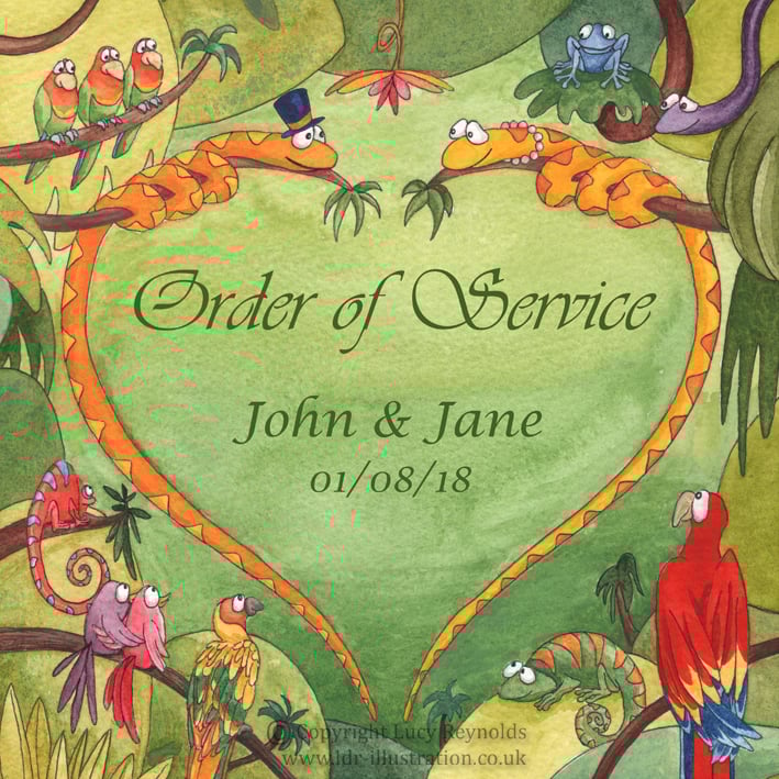 Each card measures 148mm by 148mm and comes with a matching white envelope. The front features the pictured jungle illustration, with your choice of names and date. The back of the card can be viewed by scrolling through the images above. The inside can be left blank or personalised with your choice of text.