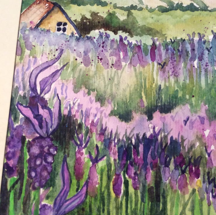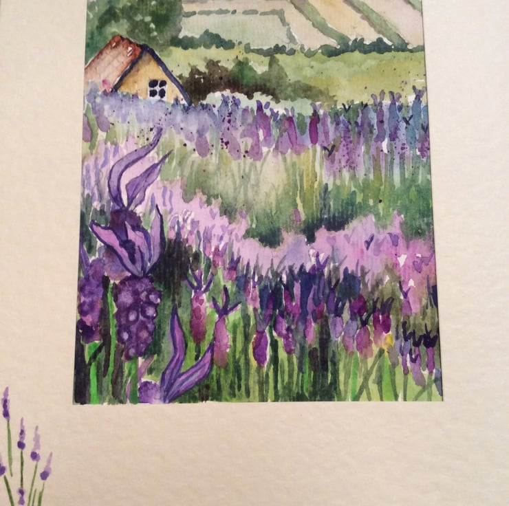 I specialise in creating handmade cards using my original watercolour paintings and not prints to create a card that is rather different. This card depicts purple lavender flowers in the foreground which become more impressionistic as they recede into the background. I use a range of watercolour techniques such as wet on wet, wax resist and splattering to create my unique style. The painting has been mounted in a window framed card so after use the painting can be easily removed and framed as an original piece of artwork. The card has been left blank inside for your own personal message and comes with an envelope.