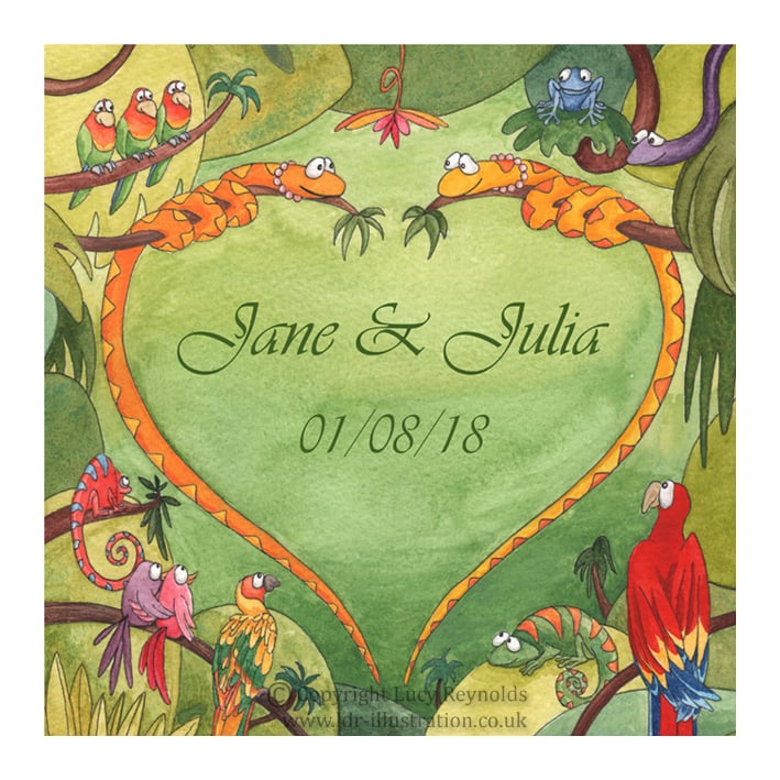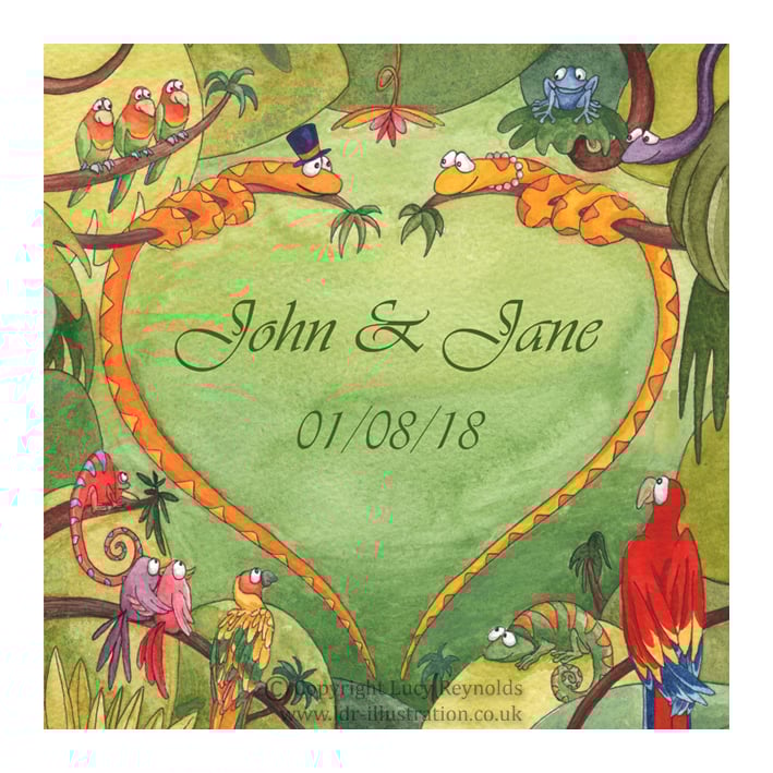 This print is available for bride and groom, groom and groom or bride and bride (the only difference being whether the snakes are wearing top hats or necklaces). Please see the additional images above and select an option when ordering. Thanks.