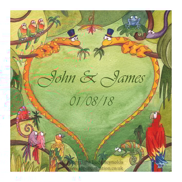 This print is available for bride and groom, groom and groom or bride and bride (the only difference being whether the snakes are wearing top hats or necklaces). Please see the additional images above and select an option when ordering. Thanks.