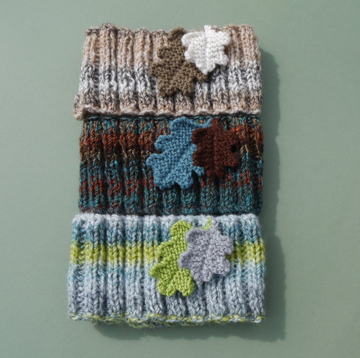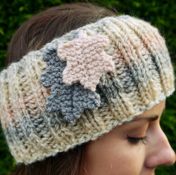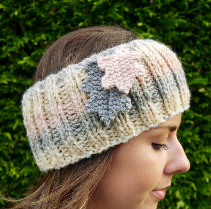 A lovely chunky ribbed headband in pale shades of cream, grey and pink. I have attached two knitted oak leaves in complementary colours. Hand knitted with a marble effect good quality warm chunky yarn. I have knitted this on a circular needle so there are no seams. The ribbed effect means that it is very stretchy and will fit most head sizes, from teenager to adult.
