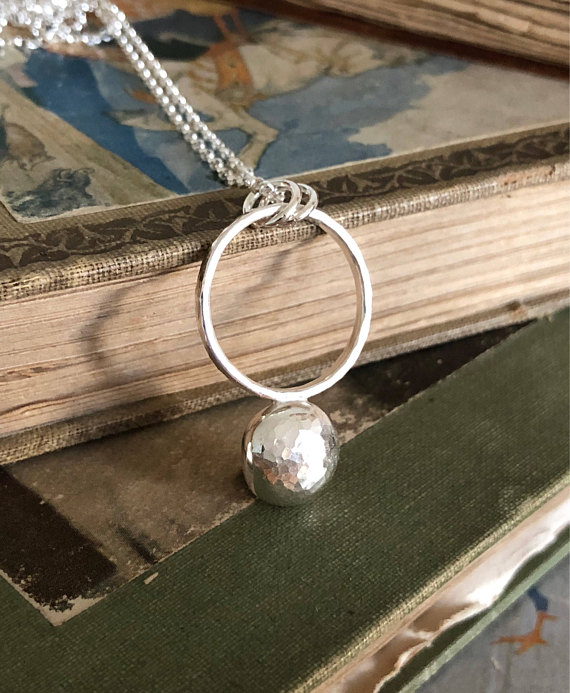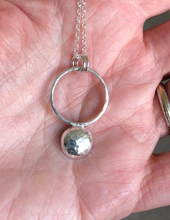 This beautiful large silver pebble ring pendant has been handmade from recycled silver. The pebble and the ring both have a sparkly hammered texture and there are two small rings attached, to hang the pendant from a chain.