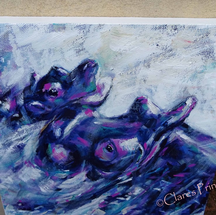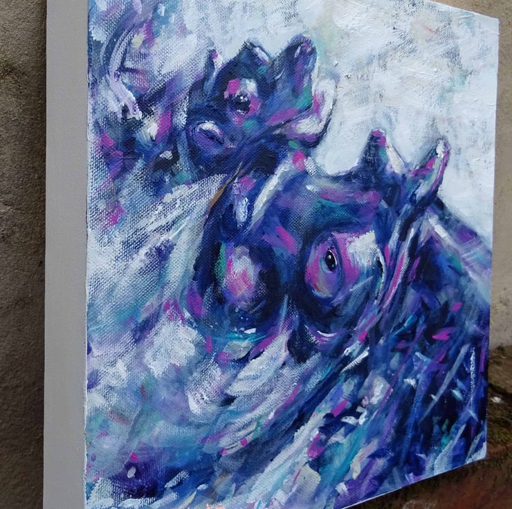 Original acrylic painting of a mother and baby hippo having gtreat fun splashing in the water!