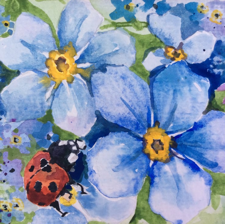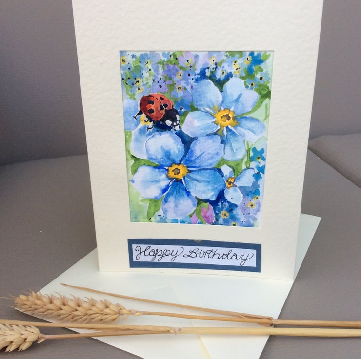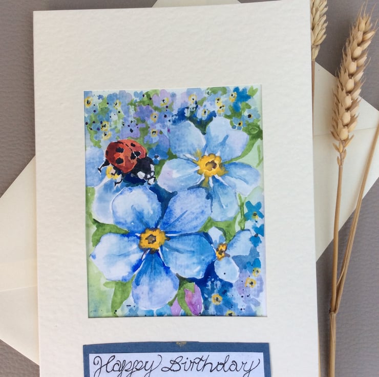 I specialise in creating handpainted greeting cards which are made using my original watercolour paintings and not prints so the recipient will receive a unique card. I use a range of watercolour techniques such as wet on wet, wax resist and splattering to create my unique style. This painting depicts a ladybug on blue forget-me-not flowers and has the words'Happy birthday ' written underneath. The painting has been mounted in a window framed card so after use the painting can be easily removed and framed. The card has been left blank inside for your own personal message and comes with an envelope.