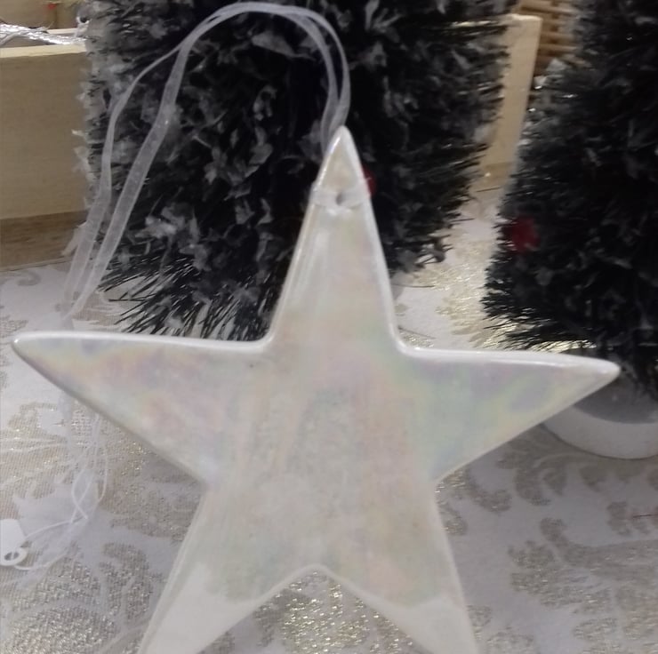 Handmade porcelain paper clay star hanging decoration with mother of pearl lustre, white organza ribbon for hanging. Not glazed on the back of star. Size approx 10cm by 10cm, smaller sizes also available.