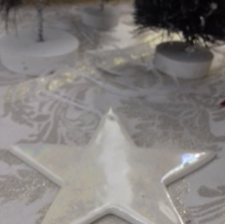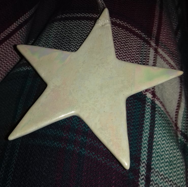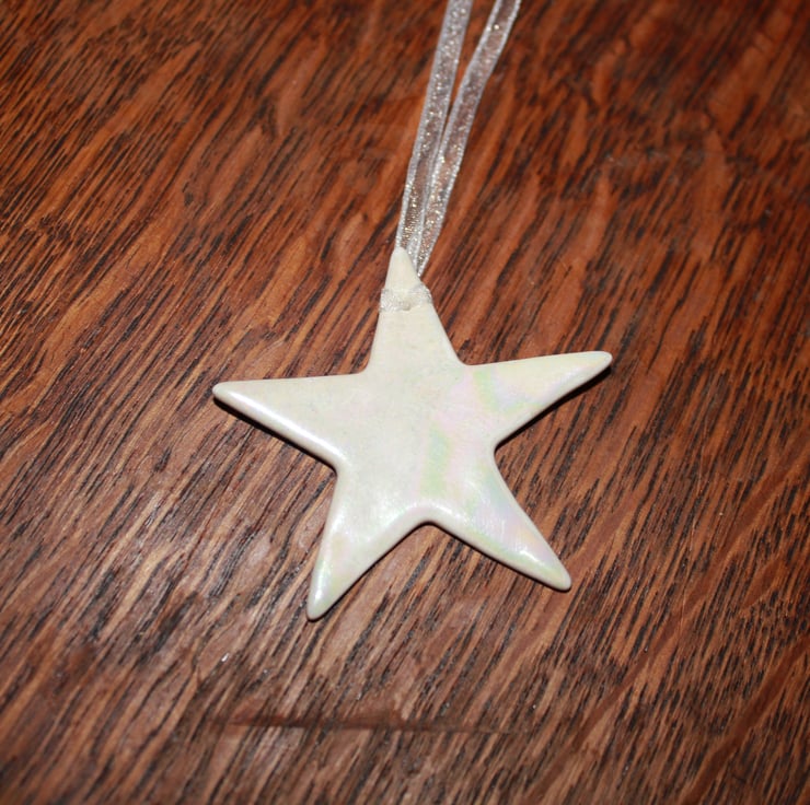 Handmade porcelain paper clay star hanging decoration with mother of pearl lustre, white organza ribbon for hanging. Not glazed on the back of star. Size approx 10cm by 10cm, smaller sizes also available.