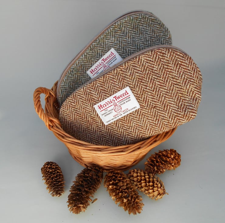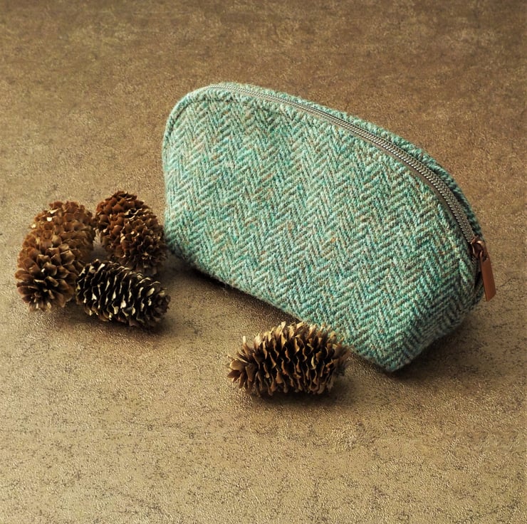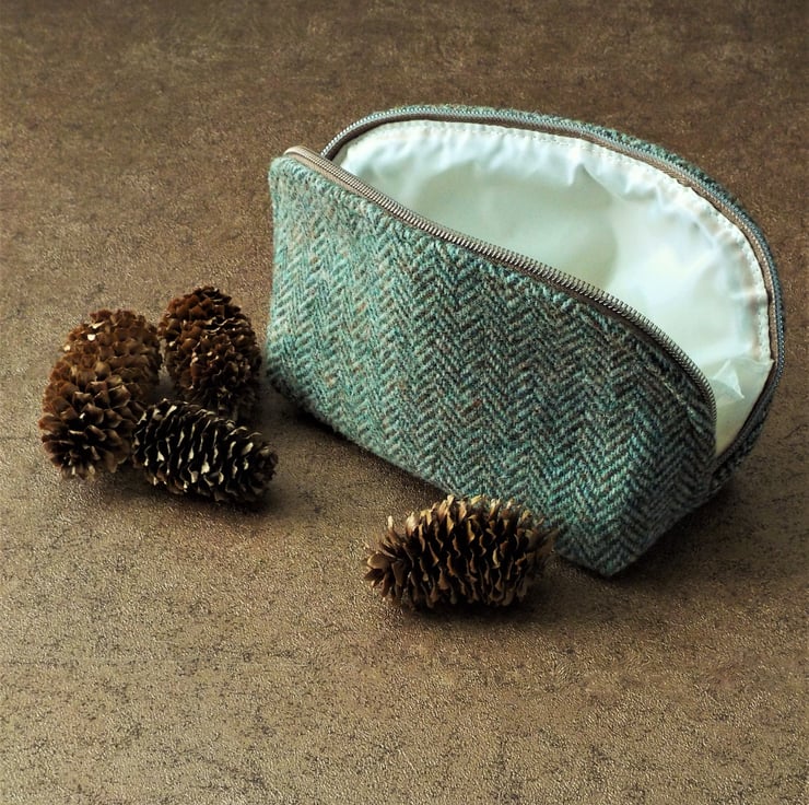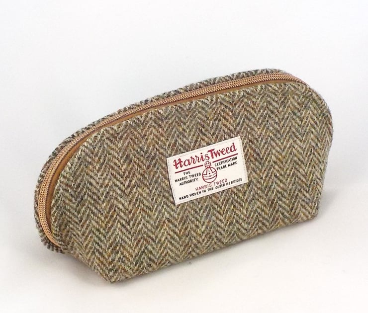 What a great gift! I have used an olive green herringbone design of Harris tweed to make this stylish toiletries bag. This bag measures 16 x 9cm at the base, and 10cm tall, with a rectangular base morphing to a curved top. One long zip curves over the top so it opens wide, revealing a practical wipe-clean nylon interior. The "Orb" label, your guarantee of genuine Harris tweed, is proudly displayed.