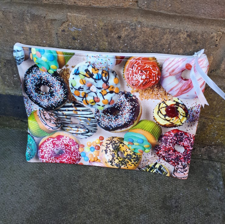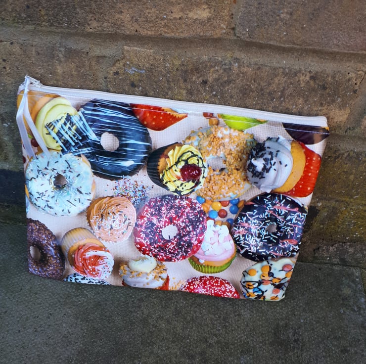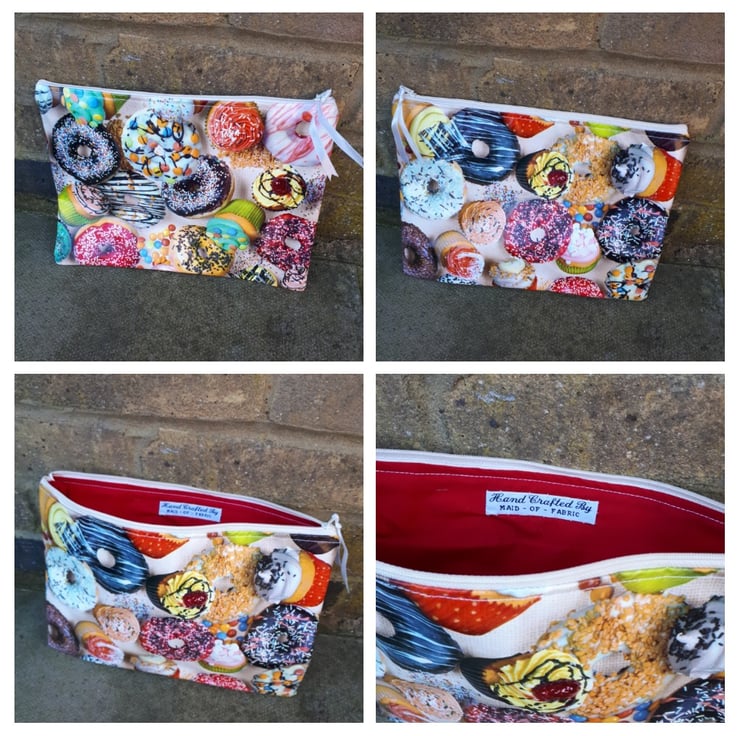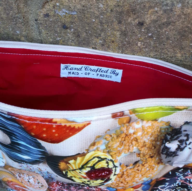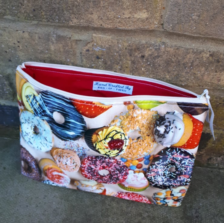 Beautiful brightly coloured doughnuts and cupcakes, lined with red lining.