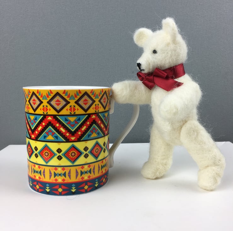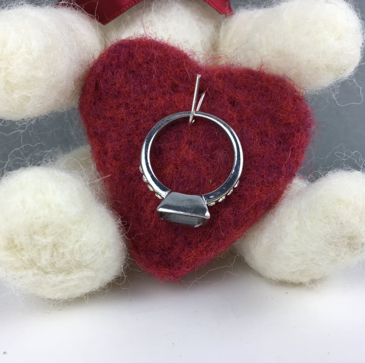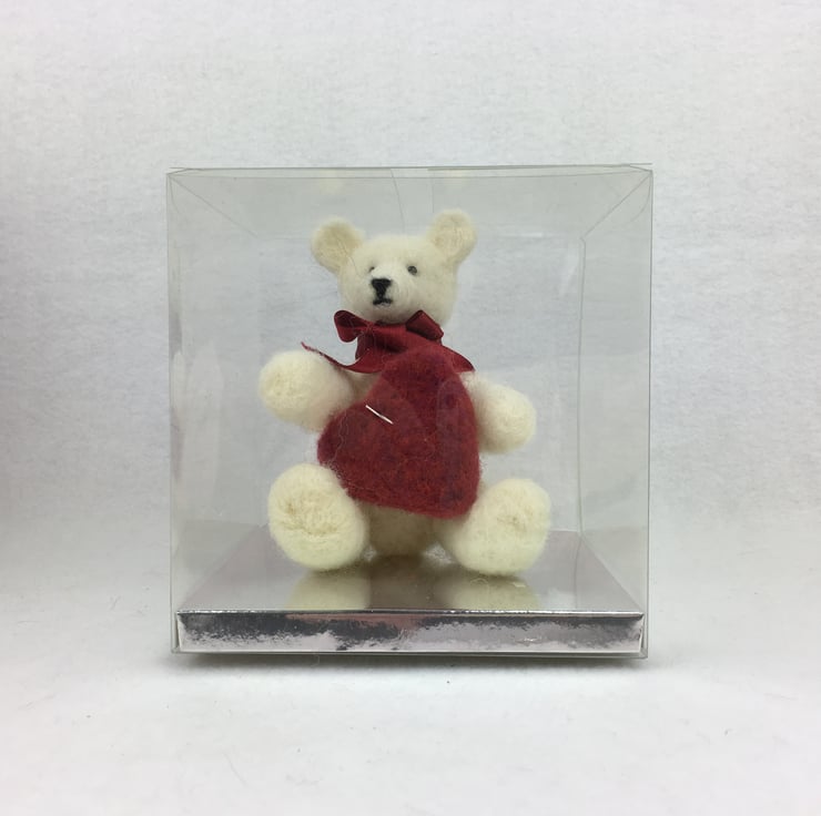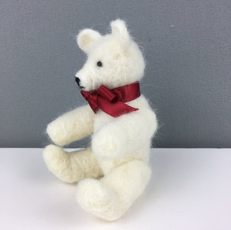 The bear has been needle felted using white wool fibres. He stands approximately 14cm (5.5") tall, 10cm (4") sitting and has poseable limbs, beaded eyes and a red ribbon around his neck. He is supplied holding a needle felted heart. If you wish to use him as a proposal bear a small hook of wire (easily removable) is attached to the heart allowing you to hang your proposal ring in place (as shown in photos).