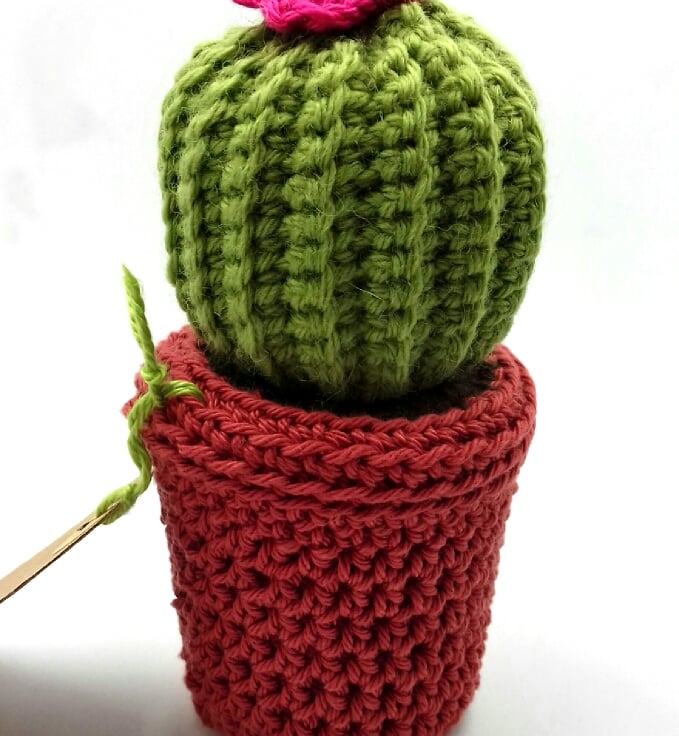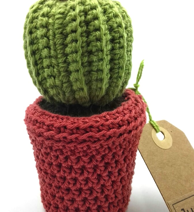 This cactus ( pattern from Zoecreates.co. uk) has been crocheted in wool and 'planted' in a terracotta coloured pot which covers an plastic plant pot. The base is filled with re-purposed heavy cotton fabric for stability. The soil is crocheted from acrylic yarn over a circke of cardboard. The whole decoration stands approximately 13 cm tall. The tag reads 'Just to say... 'on one side and is blank on the other for your own message. It would make an unusual keepsake alternative to a greetings card for many an occasion!