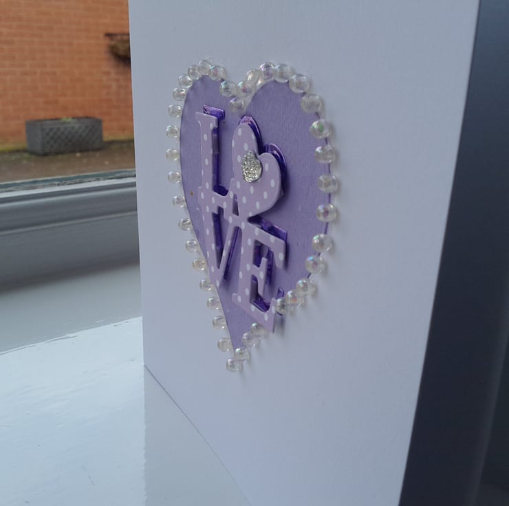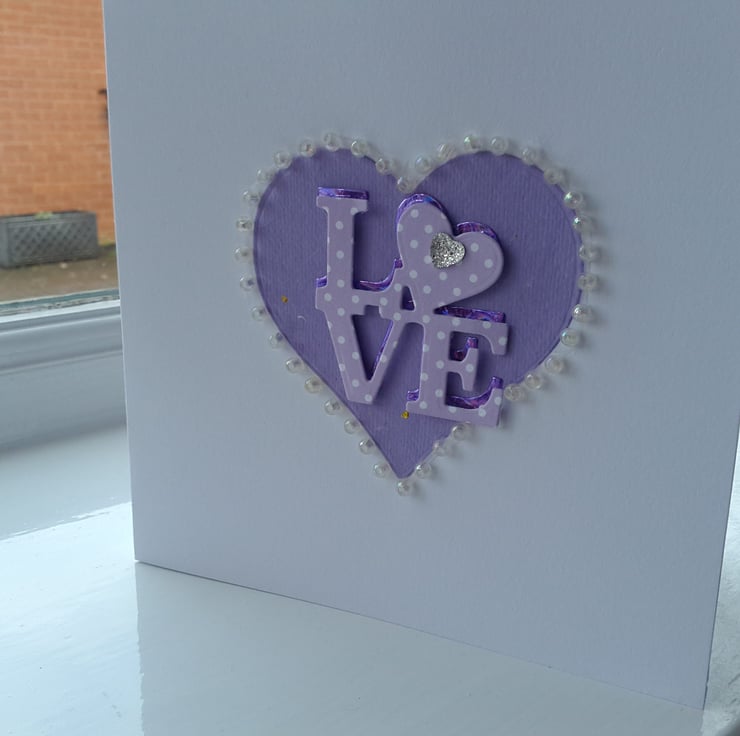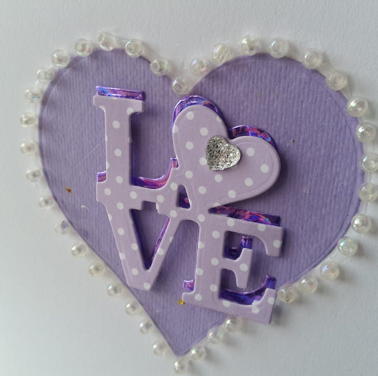 A completely handmade and uniquely designed card. Consisting of a heart die cut from lilac handmade paper mounted on to qualify pristine white card. The word love die cut from purple mirri card then topped again in lilac and white spotty card offset to give it a 3d effect. Finished off with the heart surrounded with pearl beads