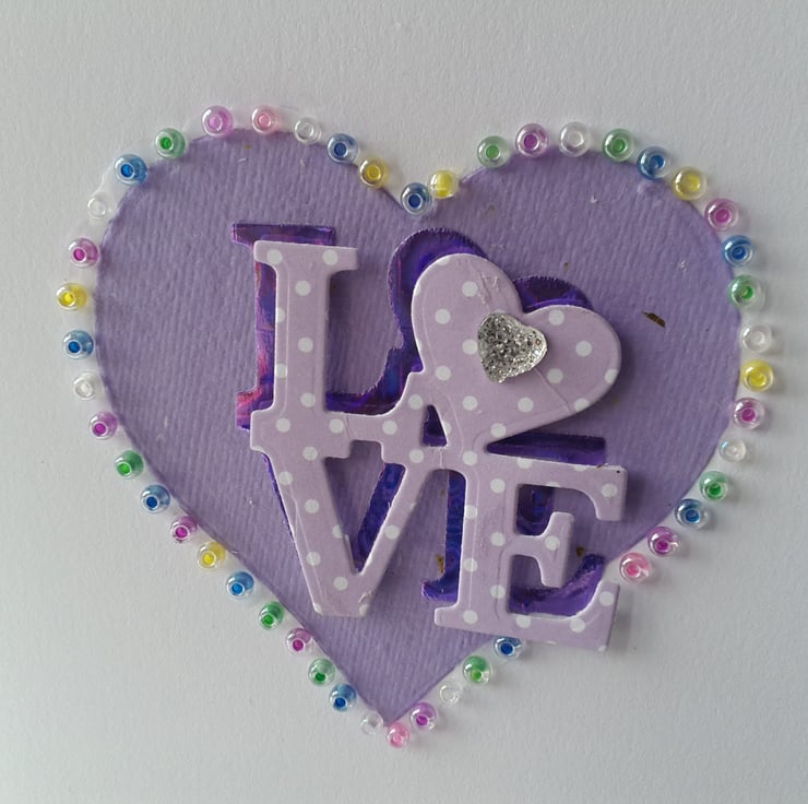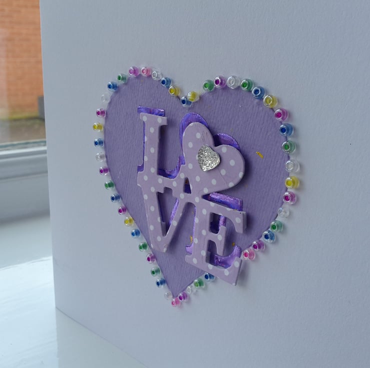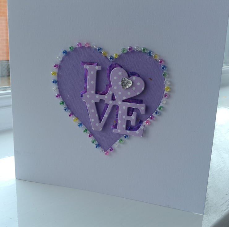 A completely handmade and uniquely designed card. Consisting of a heart die cut from lilac handmde paper mounted onto quality pristine white card. The heart had been surrounded by co ordinating pastel shaded beads. The word die cut from purple mirri card then lilac dotty paper mounted offset on top of each other to give a 3d effect
