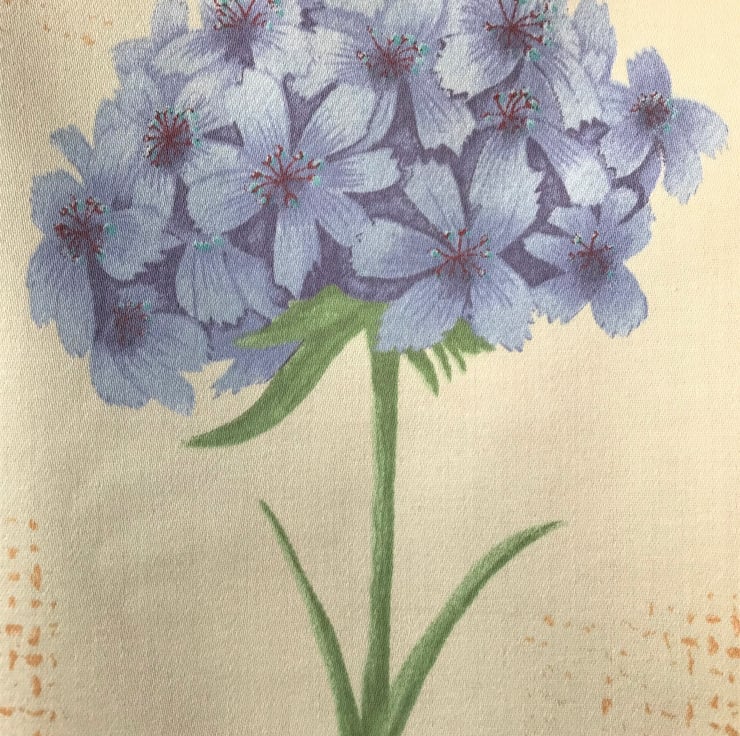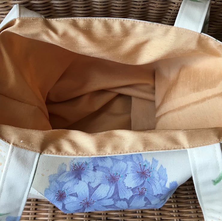 A pretty tote bag in pale yellow fabric with a floral print pattern featuring a green stem and leaves topped with a cluster of blue flowers. Areas of the fabric have a pattern of golden yellow speckles The bag is lined with golden yellow fabric which co-ordinates beautifully with the speckled areas of the outer fabric.