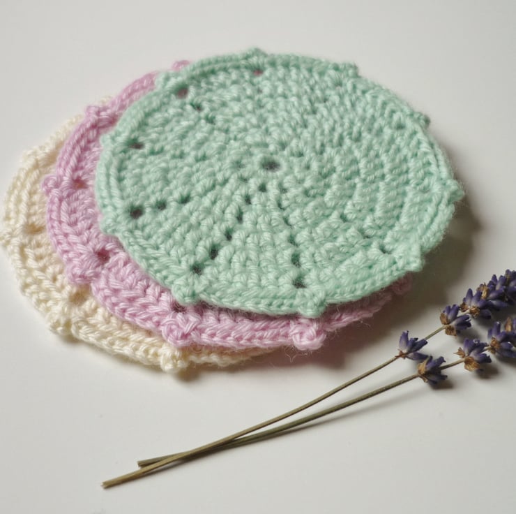 I hand crocheted these 3 doilies using fine wool blend yarns in mint, pink and cream. The soft, pastel shades make them ideal for a nursery and kids' room. They will brighten up your tables and shelves while protecting the surface.