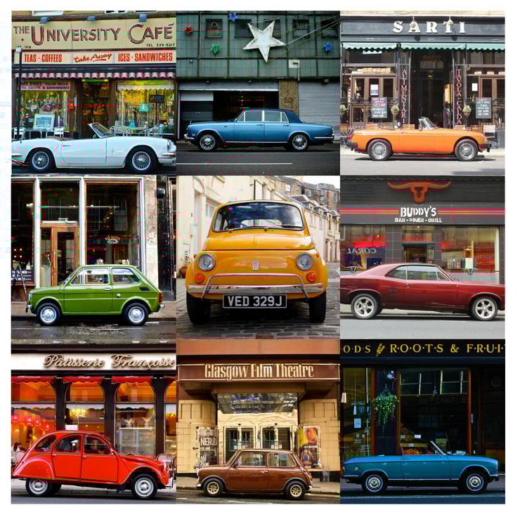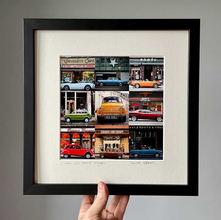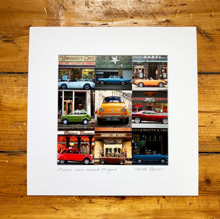 A signed mounted print of my Classic Cars around Glasgow compilation featuring some beautiful vibrantly coloured cars and instantly recognisable Glasgow backdrops.