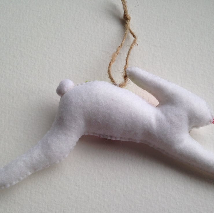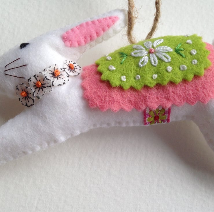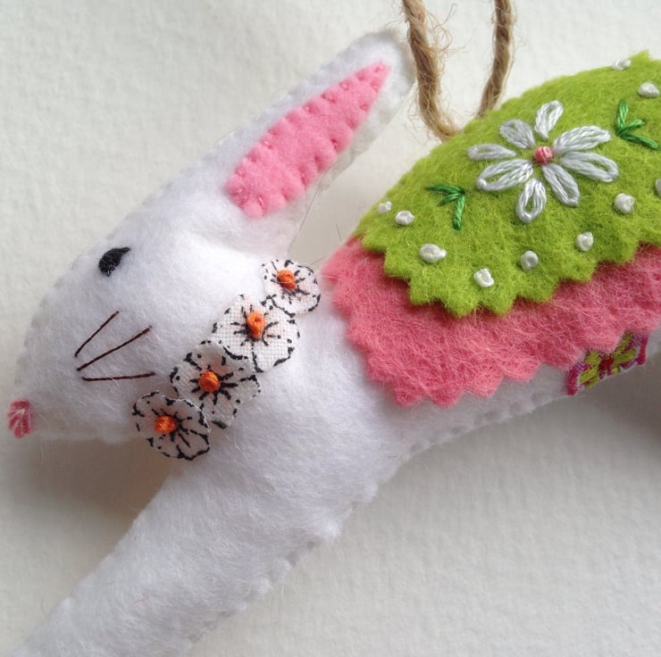 I have designed and hand sewn this wool felt rabbit. It measures 16cm long, is 5cm high and 2 cm thick. It is filled with toy stuffing and is decorated with a flowery collar, and and embroidered felt coat on one side. It has a small fluffy tail and there is a loop of string to hang it with.