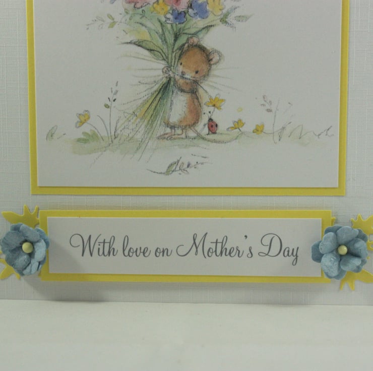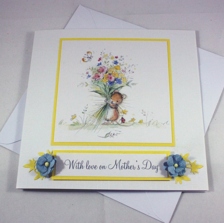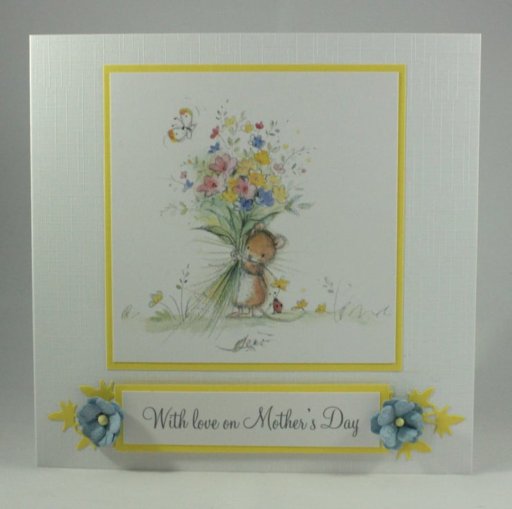 The image has been layered over yellow card, along with the message reading 'With love on Mother's Day'. The card is finished with blue paper flowers and die cut yellow foliage.
