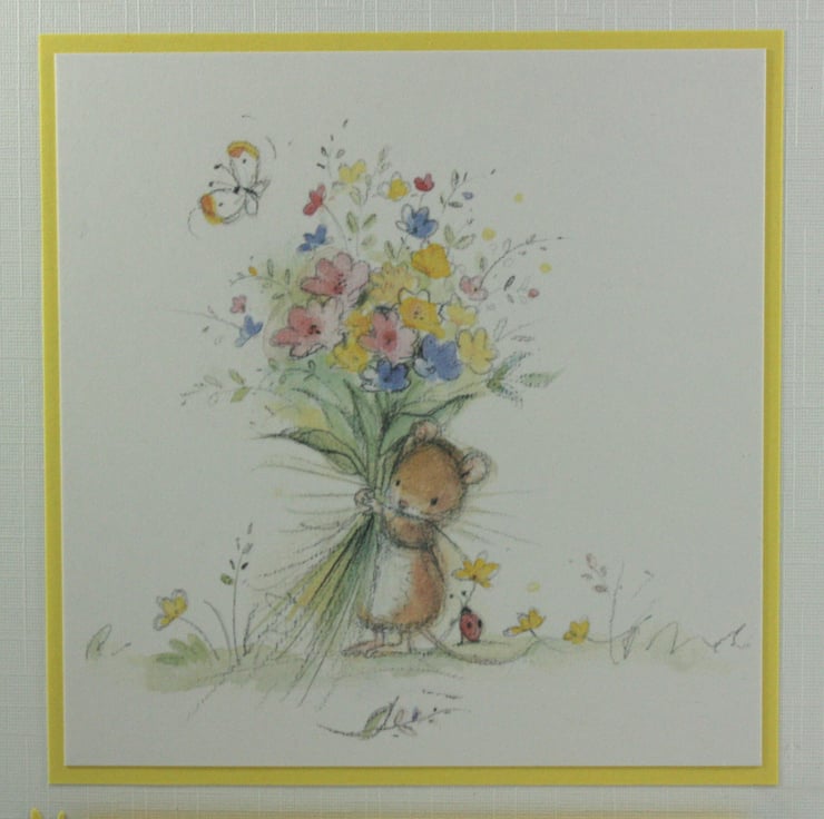 Square linen card featuring a cute image of a mouse holding a flower bouquet.
