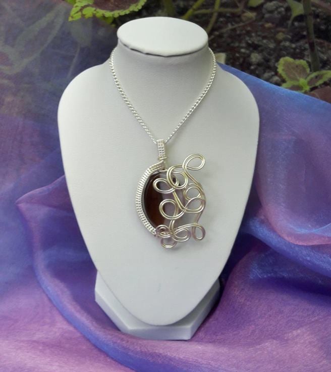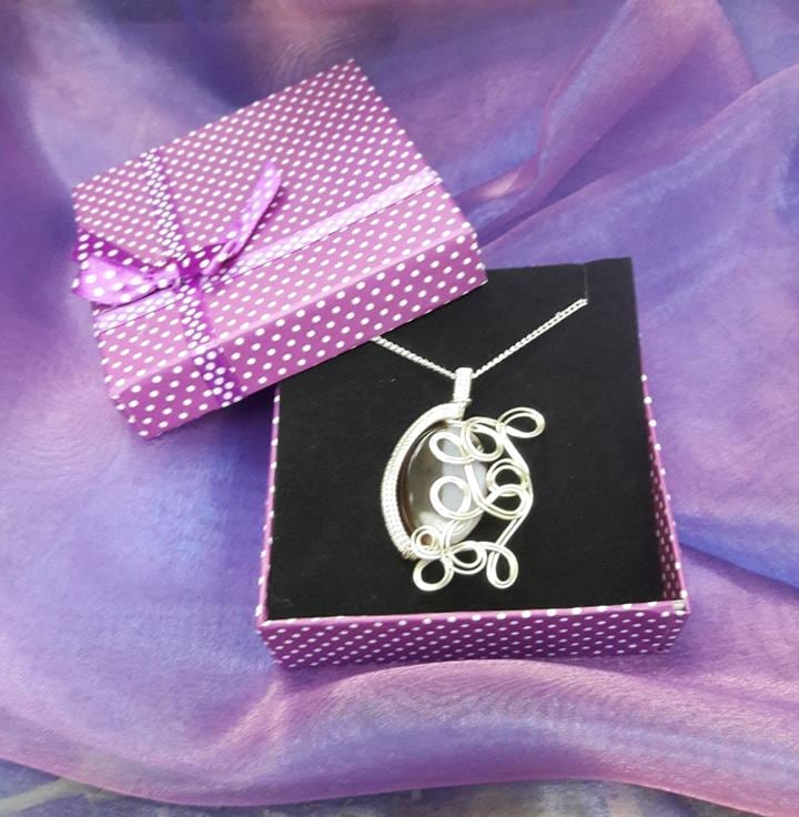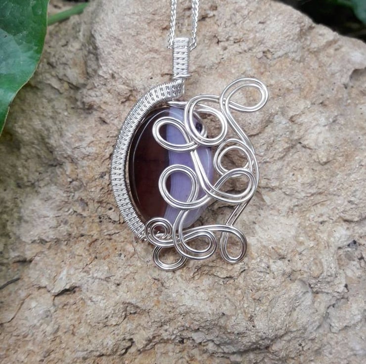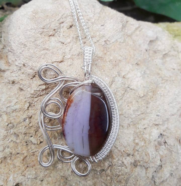 Purple Lace agate Gemstone wire wrapped, silver plated Necklace. This piece is handmade by wire weaving a number of wires together to create this beautiful cloud like effect piece. The natural swirls to one side are shaped around the colourful gemstone.