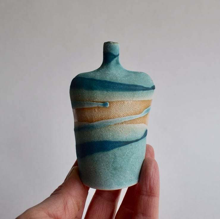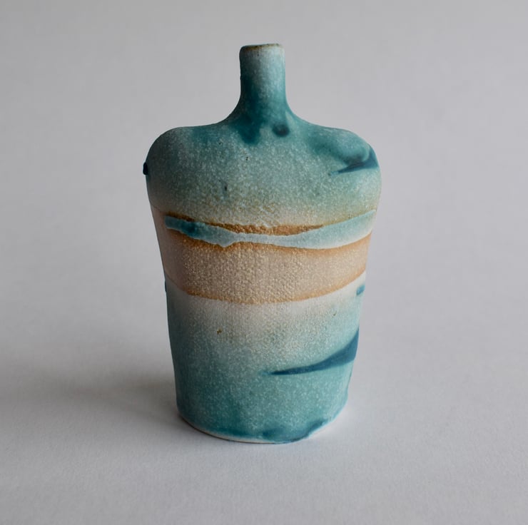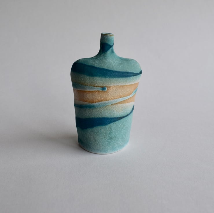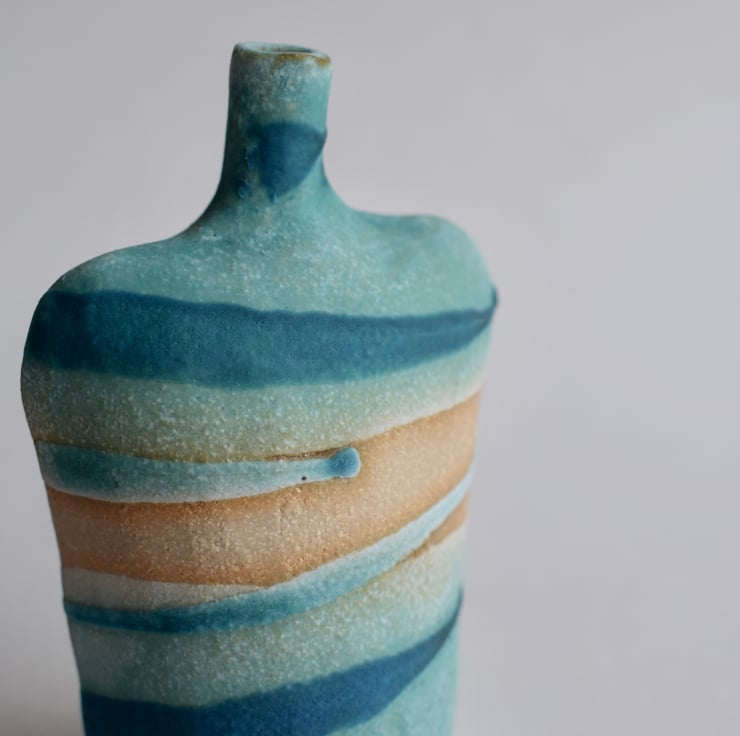 A stoneware ceramic bottle with glaze application inspired by the sea and shore. This little bottle sits well on it's own and would make a lovely gift for a birthday or Mother's day for those who love to wander by the ocean.
