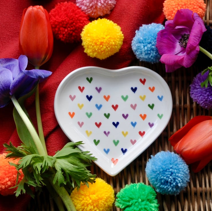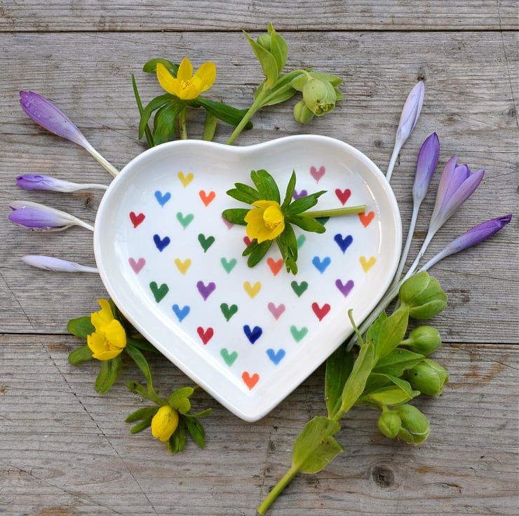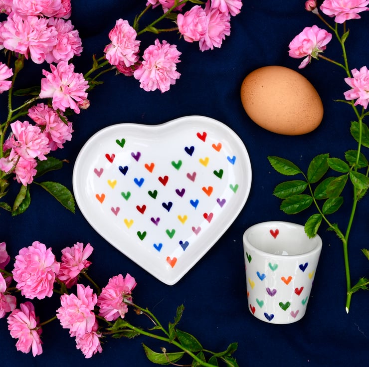 This hand painted Love Hearts heart shaped dish has a multitude of possible uses - for jewellery on the dressing-table, for biscuits at a tea party or as a matching plate for the Love Hearts egg cups.
