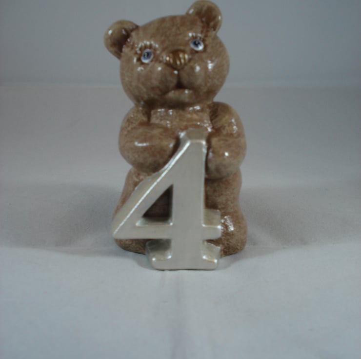 I have for sale a small ceramic animal ornament, which was hand painted by myself. It is a standing figurine bear, holding a number four between its paws. This would make a lovely Birthday cake decoration, or perhaps given as a gift.