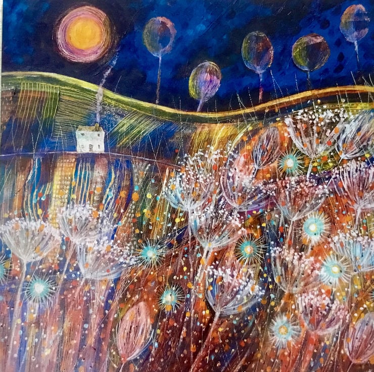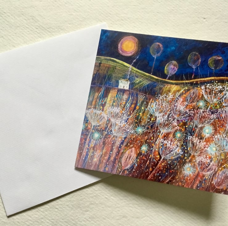This card has been made from one of my original paintings, which was inspired by a lovely harvest Moon which I saw in Jersey. The card is blank inside for you to write your own message making it suitable for many occasions. It measures 14.5x14.5cm and comes with an envelope and cello cover for protection.