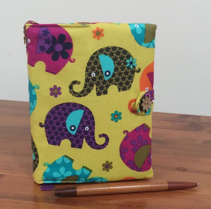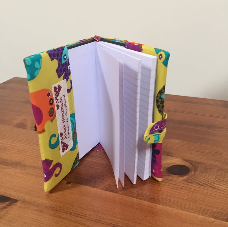 This fabric covered notebook has been made from a lovely fabric featuring funky elephants and lined with a contrasting flower cotton print.It has a fabric and wooden flower button closure and a ribbon bookmark.A gold coloured ' made with love' heart charm has been added to the outside cover for decoration.