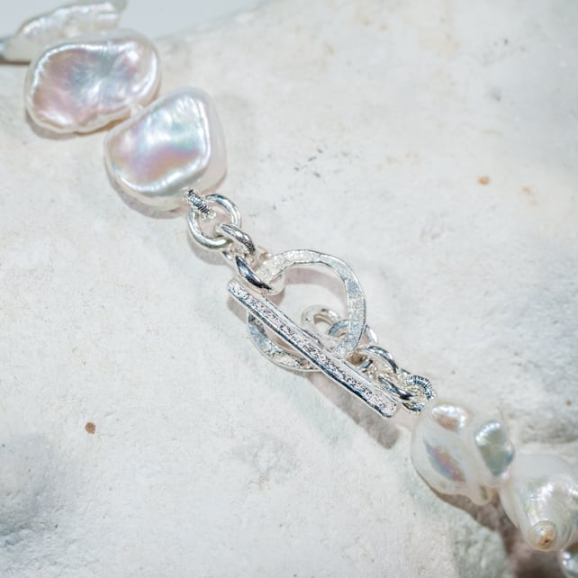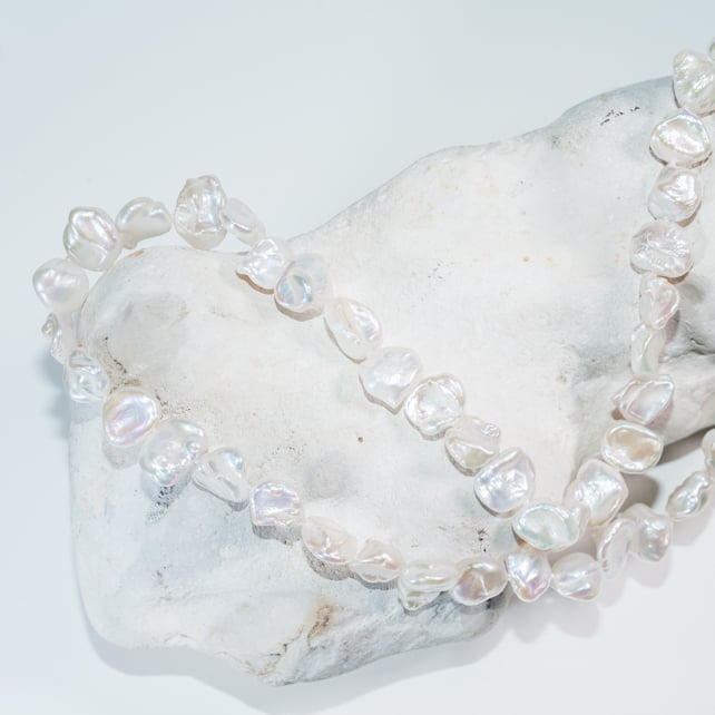 Lovely luminous large freshwater pearls measuring 18 inches long with a lovely secure handmade ecosilver watch clasp fastening and ecosilver links. I have hand-tied a knot between each pearl in the traditional japanese method - so your pearls will be super safe and secure. The watch clasp is also very secure: it requires you to actively thread the long part through the circle to fasten and unfasten - meaning your necklace stays closed.