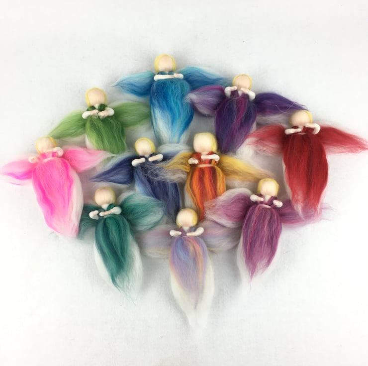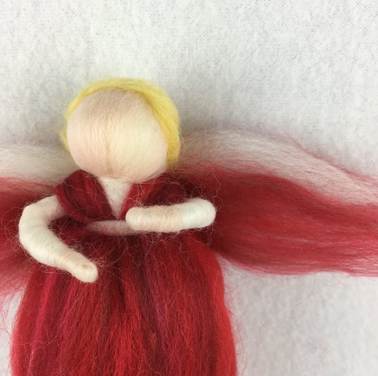 A beautiful fairy or angel made from soft merino wool fibres. The fairy has a needle felted head with the body and wings made using loose fibres in white and red. The arms are posable and a clear thread has been attached for ea of hanging. Yellow merino wool fibres form the long flowing hair.