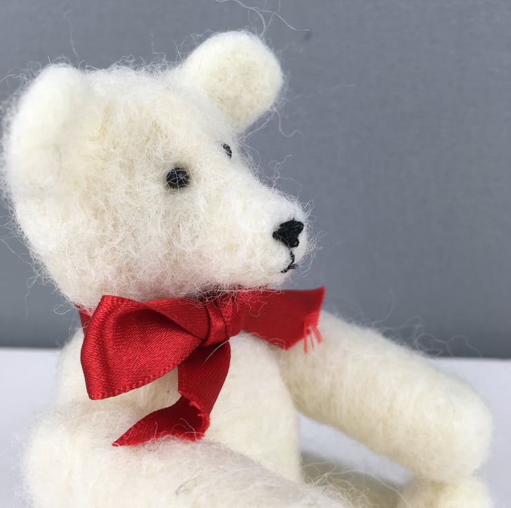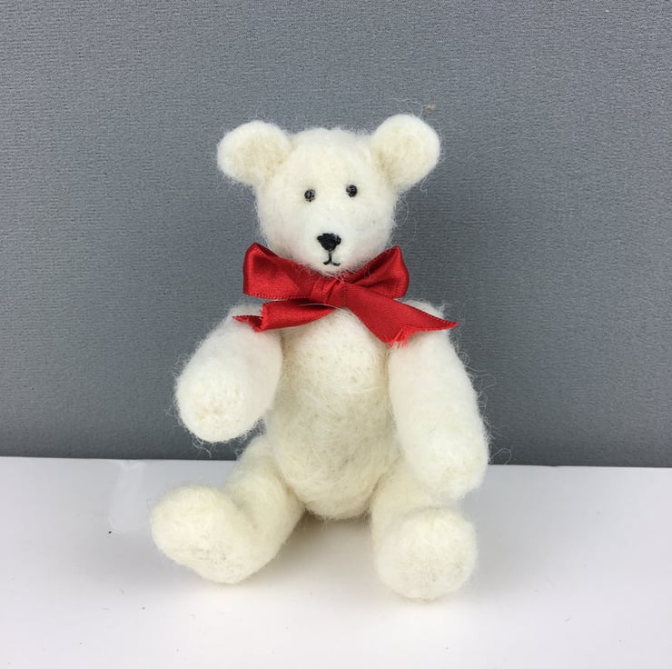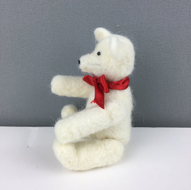 This teddy bear has been needle felted using white wool. It has a hand stitched nose and mouth, beaded eyes and moveable limbs with a red ribbon tied around its neck. The bear measures approximately 14cm (5.5") tall, 10cm (4") sitting.