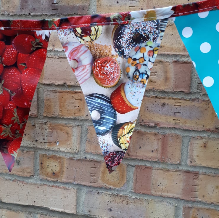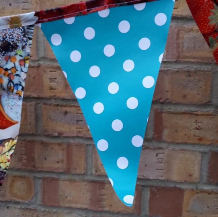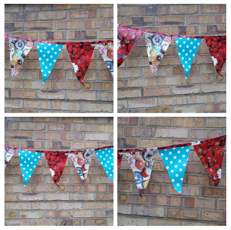 Bunting made using 3 different pvc fabrics - cakes, strawberries and turquoise polkadot.