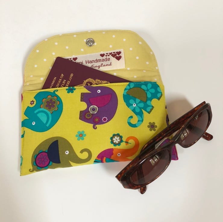 This purse has been made from a lovely fabric featuring funky elephants and lined with a contrasting polka dot cotton print.Perfect for keeping your sunglasses / passport etc safe whilst travelling or on holiday.It has been lightly padded and interfaced which gives it a lovely soft feel whilst providing protection to your glasses.The purse has a popper fastening closure.