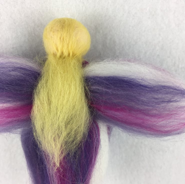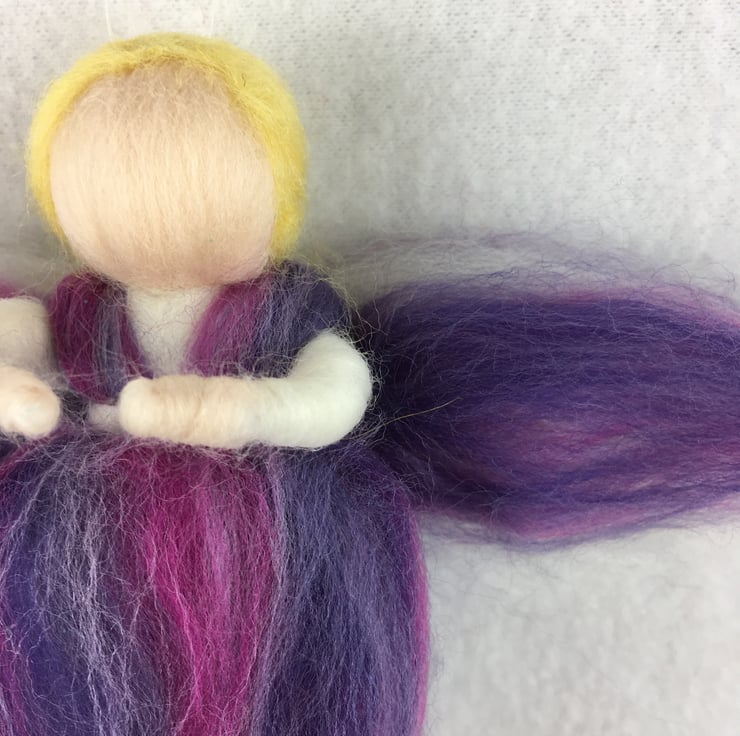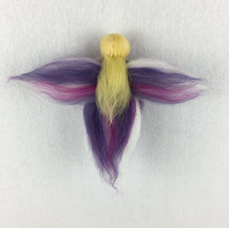 This pretty fairy has been made using white and a blend of purple merino wool fibres. The head has been needle felted while the body and wings are formed using loose woollen fibres. The arms are posable and a clear thread has been attached for ease of hanging. Yellow merino wool fibres form the long flowing hair.
