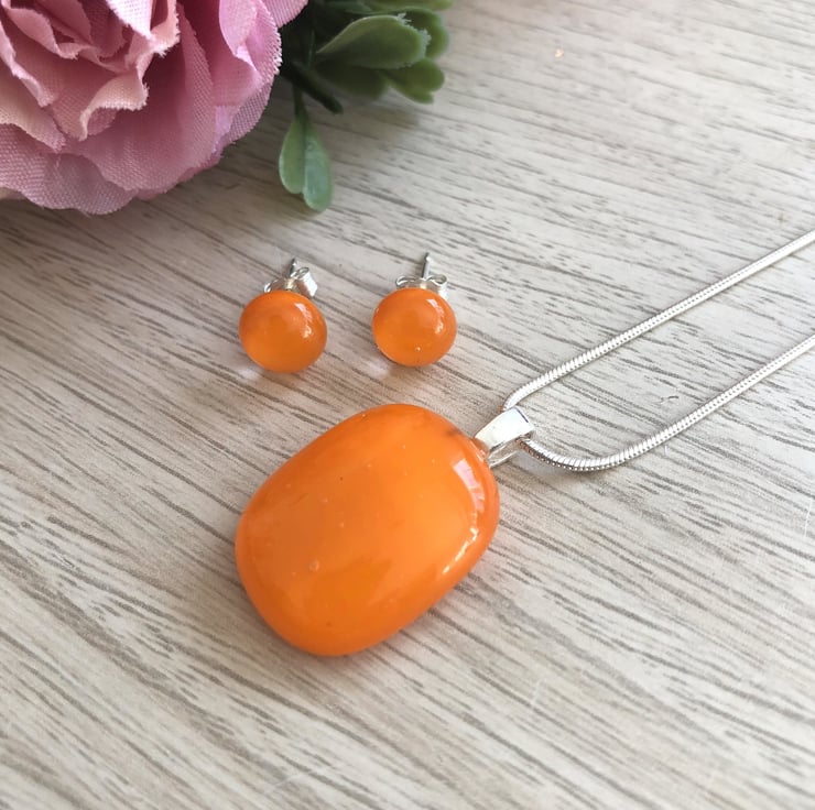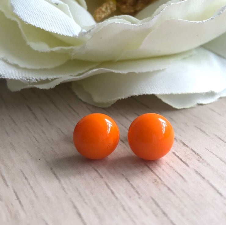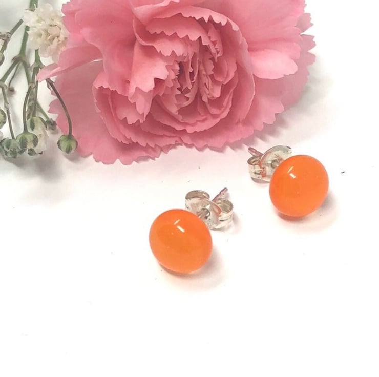 A beautiful pair of bright orange fused glass stud earrings on sterling silver backs.