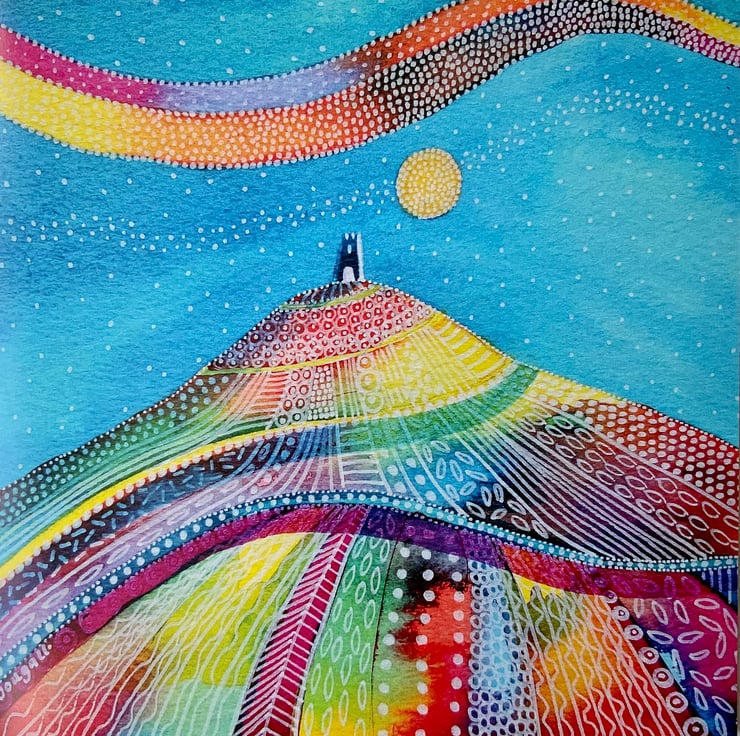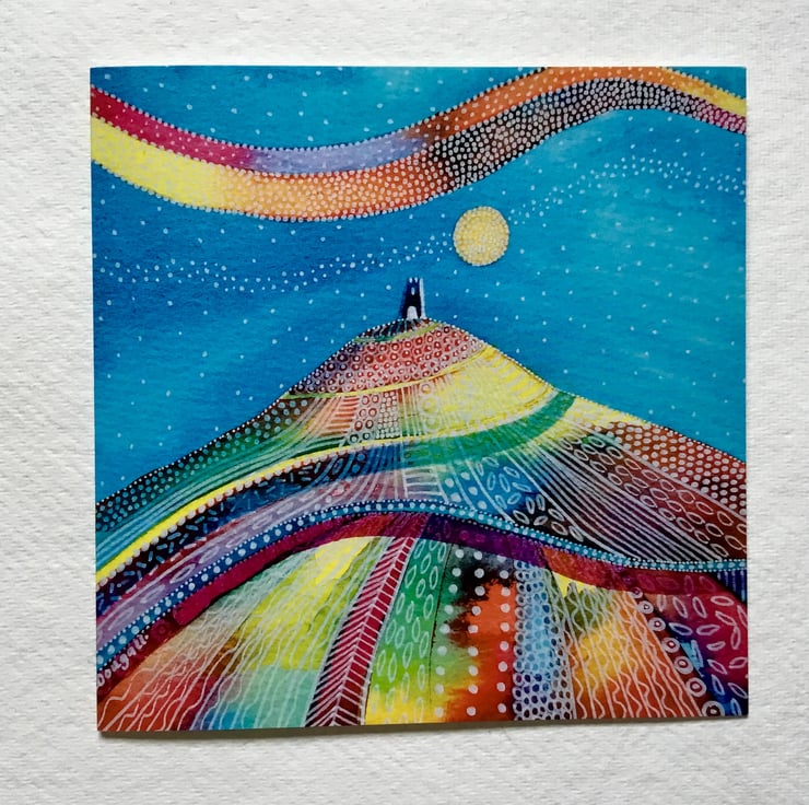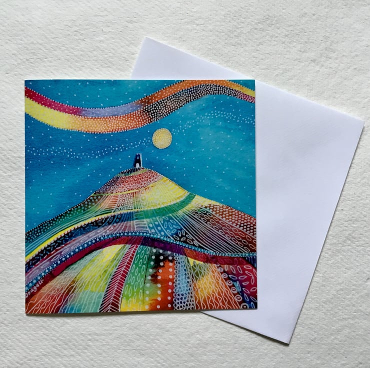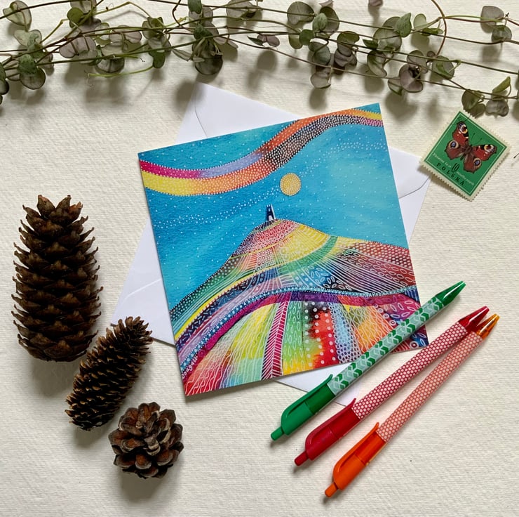 This card has been printed from an original illustration I did of Glastonbury Tor. It is a blank greetings card making it suitable for a number of occasions. It measures 14.5x14.5cm and comes with an envelope and cellophane cover for protection.