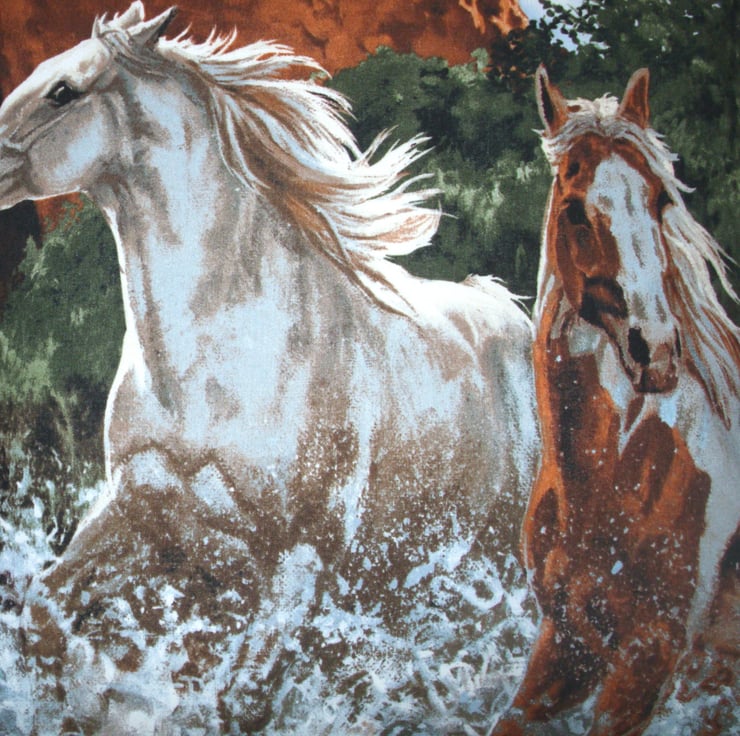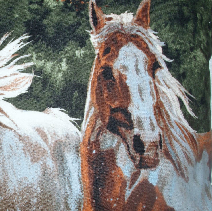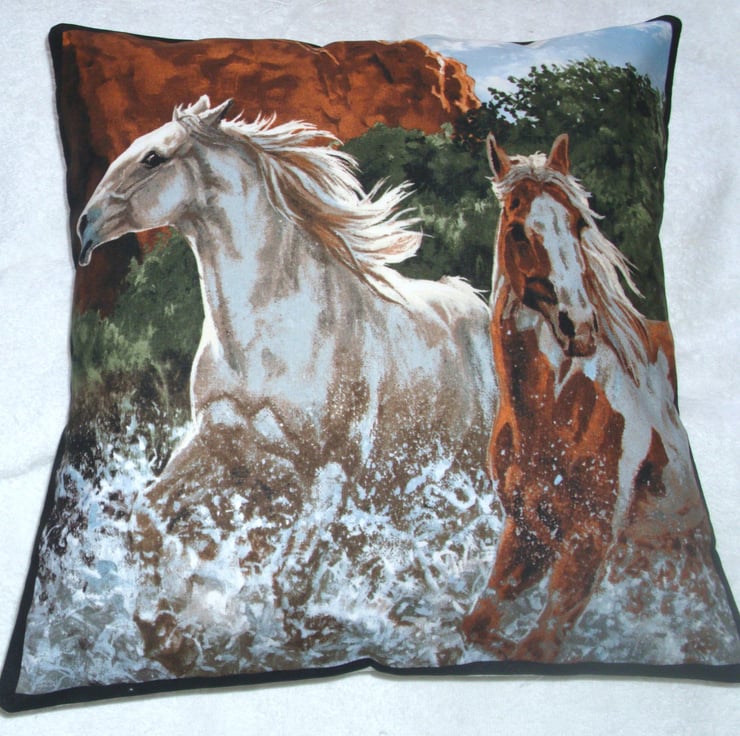 A square cushion with two wild horses, one a chestnut and the other a white horse galloping through a river. in the distance are trees and a mountain. lovely and soft cushion ,would look good in any lounge, sitting room, study or office on any settee or armchair or in a conservatory or summer house or on a bed.