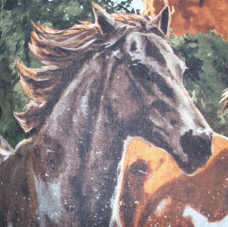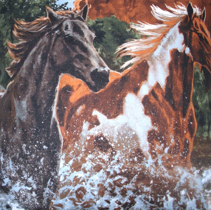 A square cushion with two wild horses, one a black and the other a brown and white , trotting through a river. in the distance are trees and a mountain. lovely and soft cushion ,would look good in any lounge, sitting room, study or office on any settee or armchair or in a conservatory or summer house or on a bed.