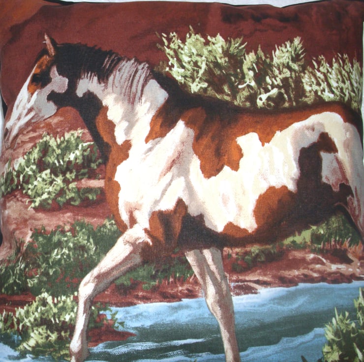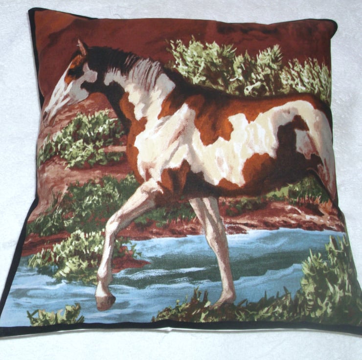 A beautiful brown and white horse stepping through a stream cushion with trees and a mountain in the distance. lovely and soft cushion ,would look good in any lounge, sitting room, study or office on any settee or armchair or in a conservatory or summer house or on a bed.
