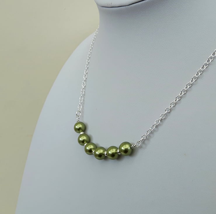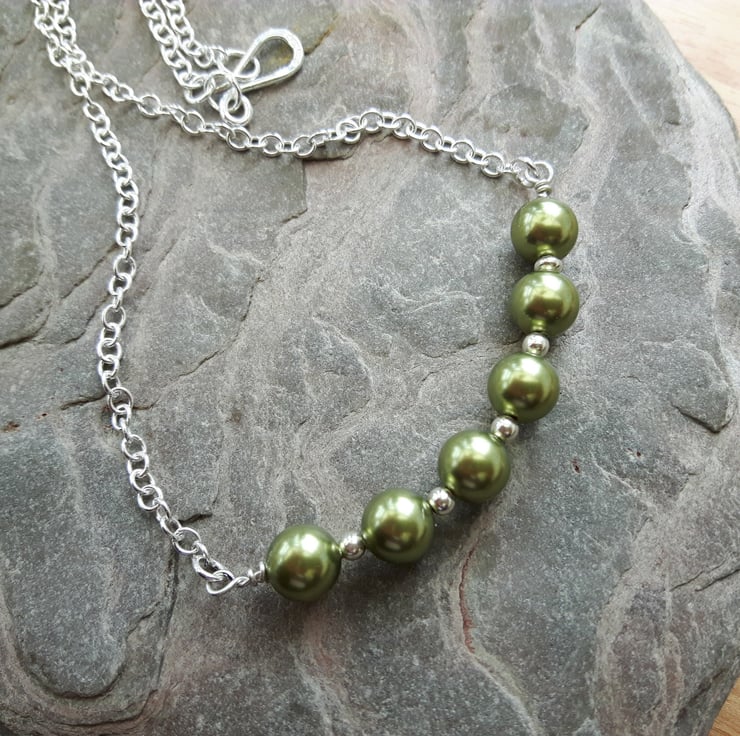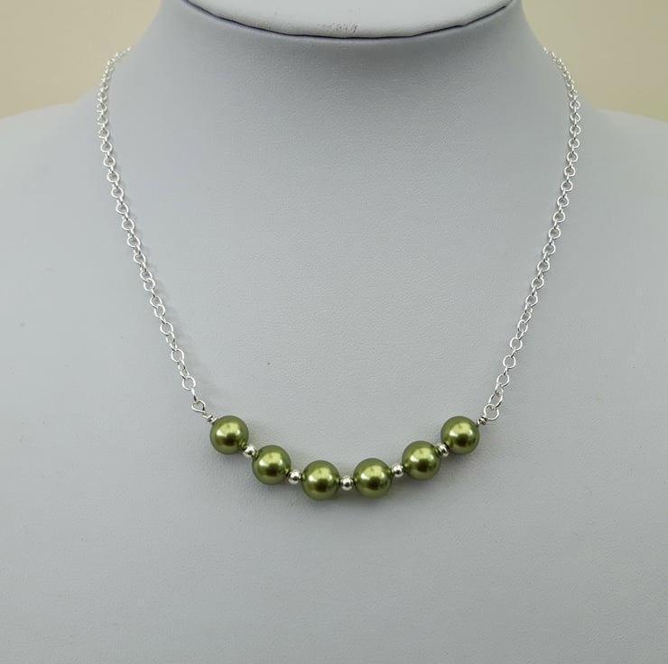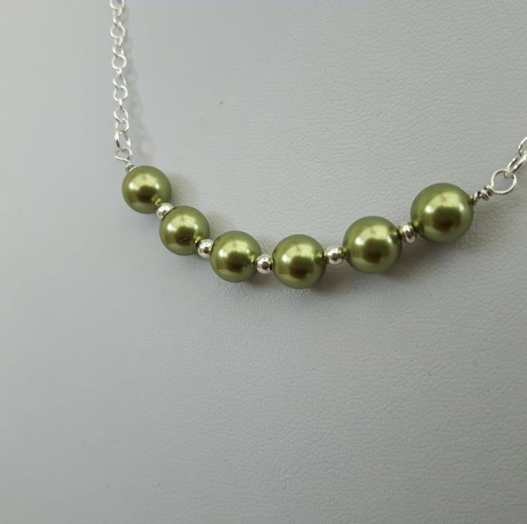 This pretty necklace features light green Swarovski pearls mounted on a sterling silver bar and alternating with round silver beads. The fresh colour is a harbinger of Spring and it would make a lovely gift for a bridesmaid. The bead bar is attached to a medium weight sterling silver trace chain, fastened by means of a handmade hook and loop clasp which has been hallmarked by the London Assay Office. There is an extension chain which allows you to vary the length.
