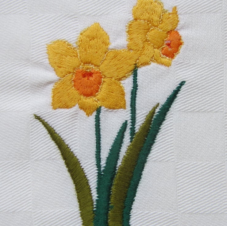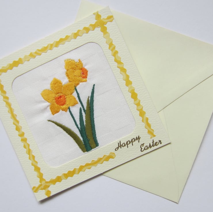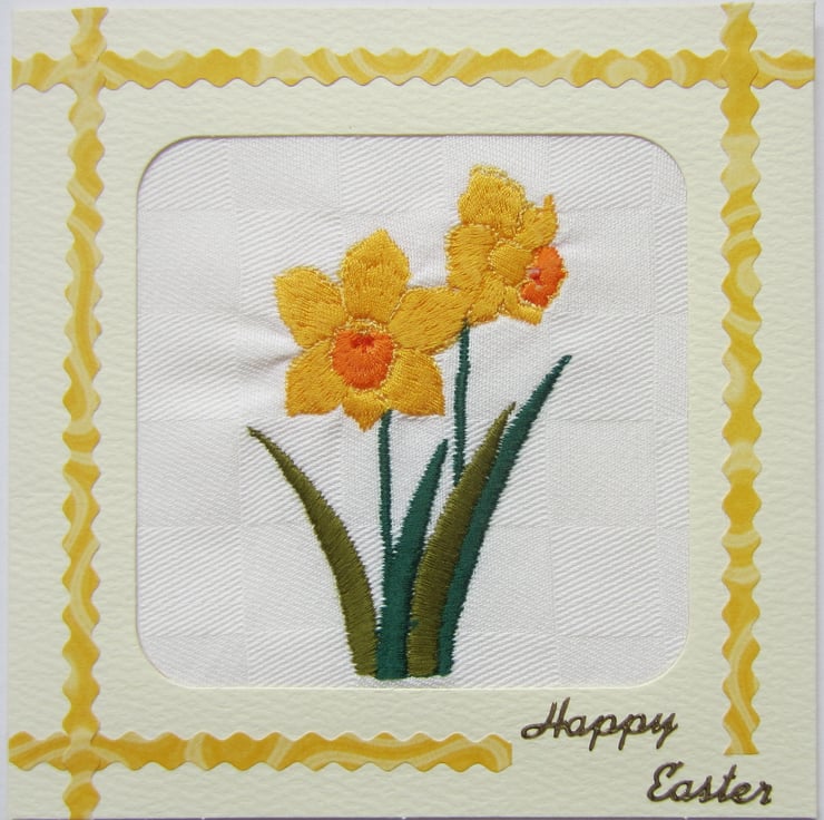 Handmade Easter card with a machine embroidered design of yellow daffodils bordered by yellow patterned crinkle paper strips and a gold coloured Happy Easter embellishment.