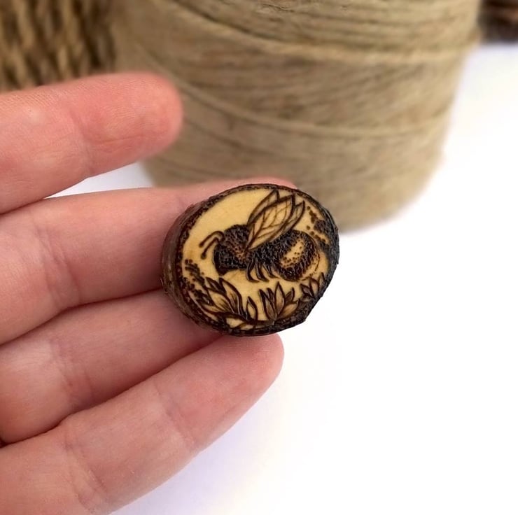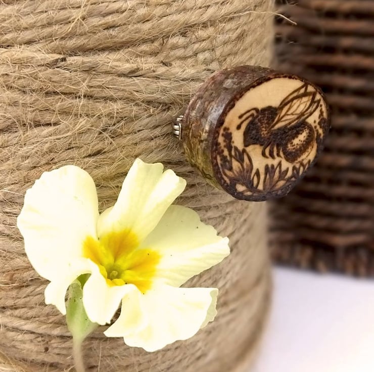 Are you a busy bee? Here is a small rustic branch slice, turned into a brooch and hand burned using pyrography. The design is a bumble bee near a flower. This would make a lovely gift for fans of British wildlife, apiarists and nature lovers.