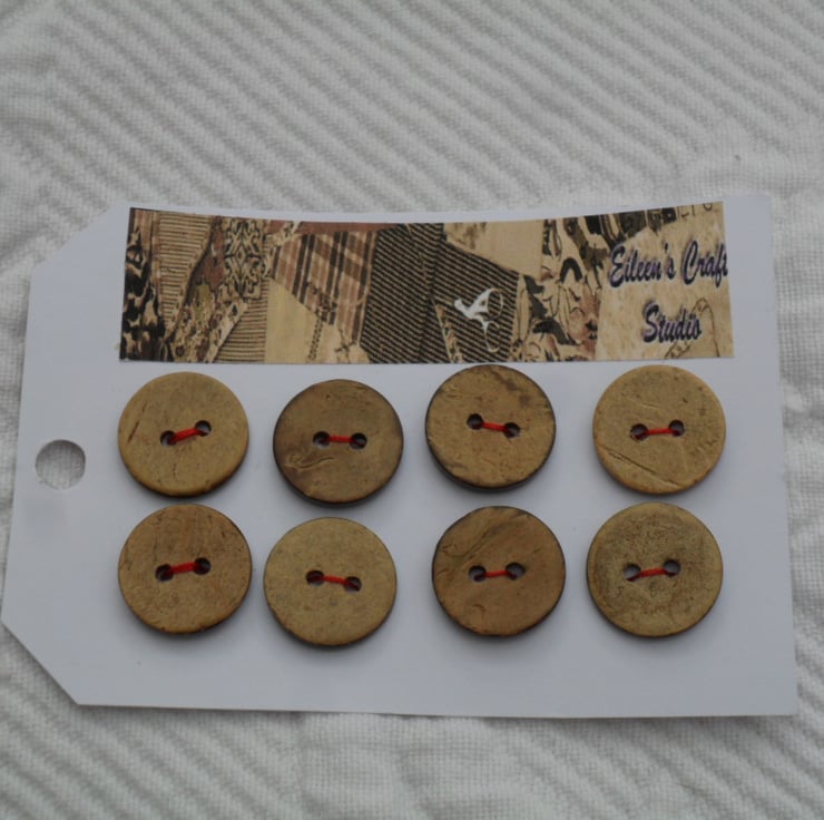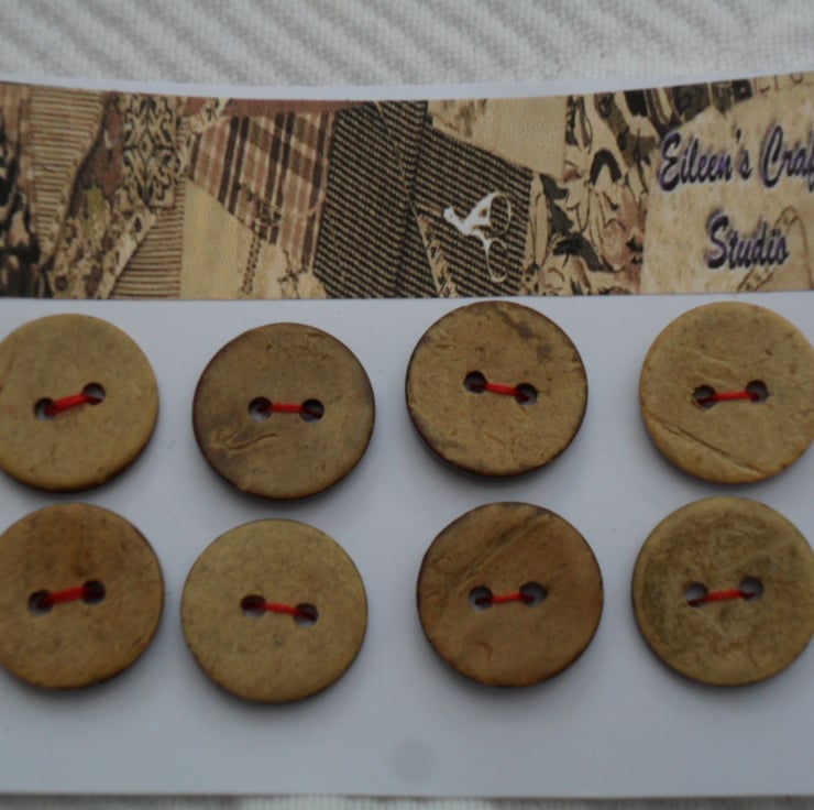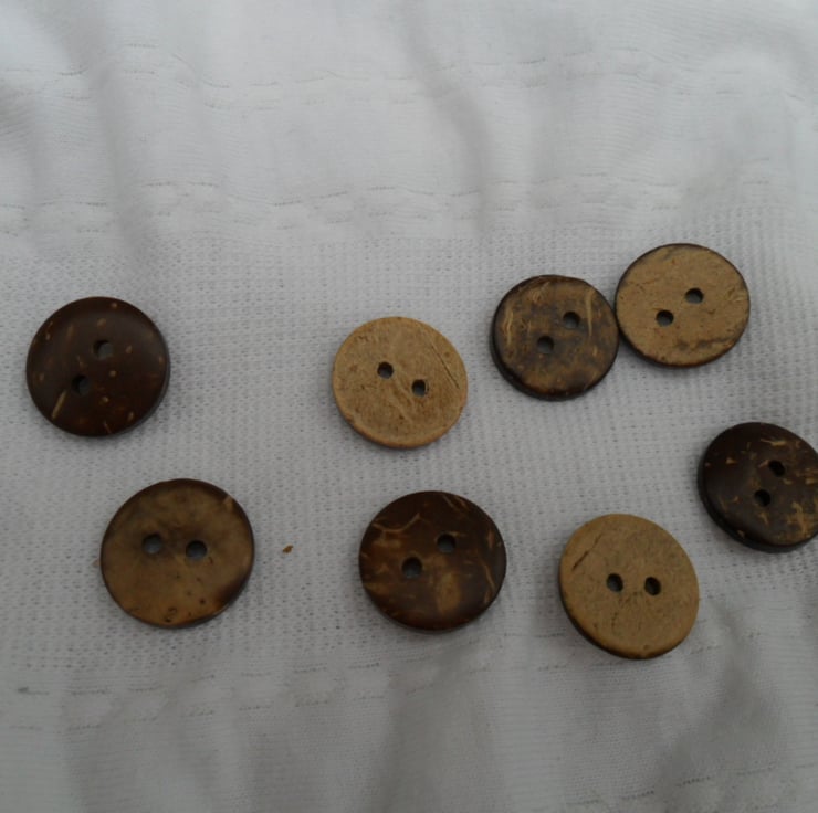 A set of eight plain cocoa nut shell buttons. As is normal with coconut shell each button is slightly different in texture and colour variation, this adds to the character of these lovely little buttons.