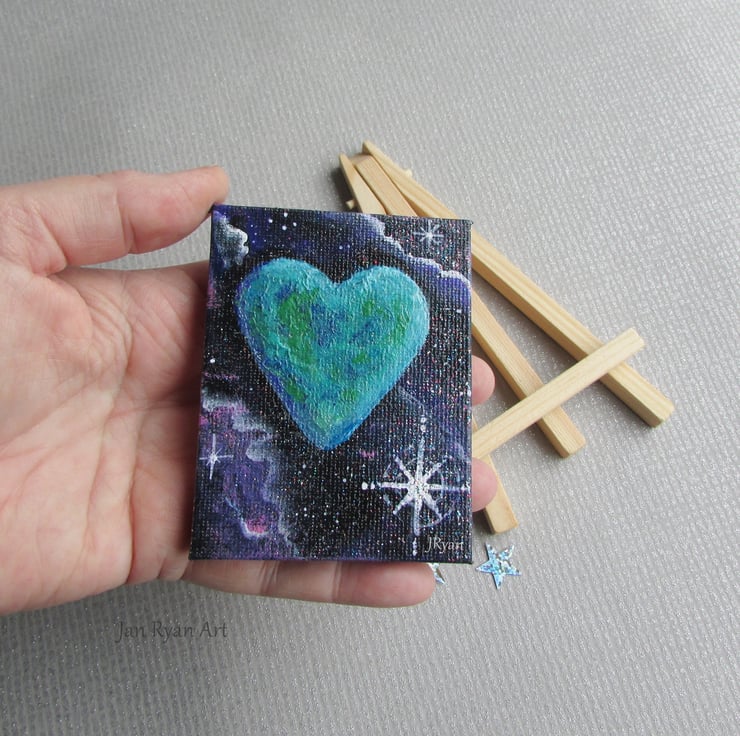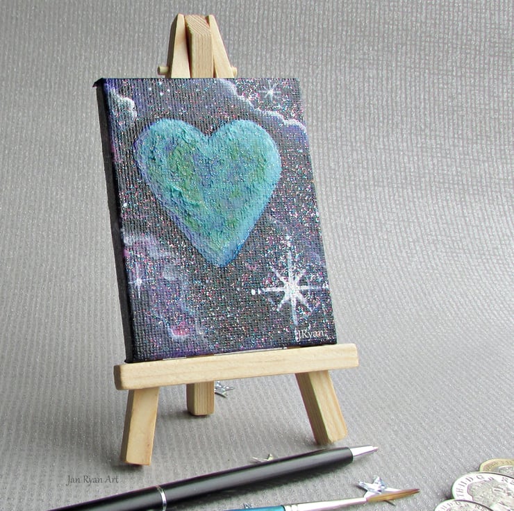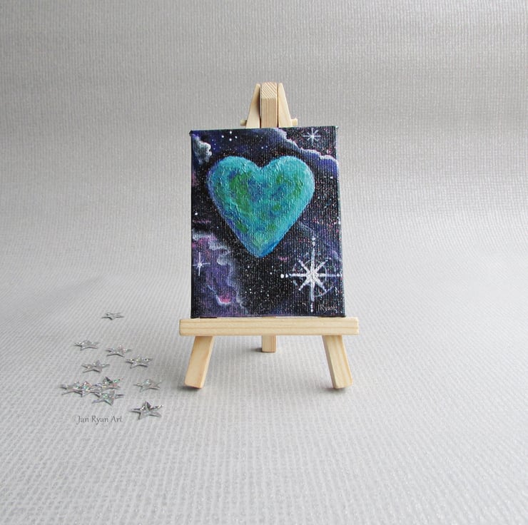 Small Heart Galaxy Painting on canvas and easel. Ideal for sitting on a desk or shelf.