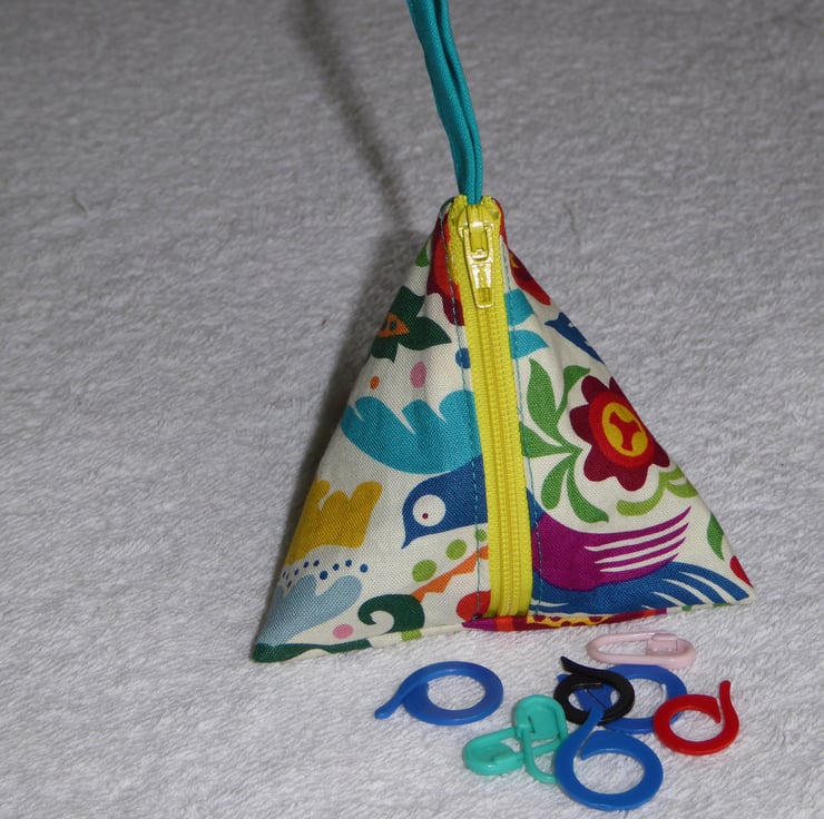 I have created this fascinating 3 dimensional 100% cotton fabric pyramid holder for little bits and bobs such as knitting stitch markers.