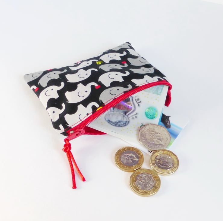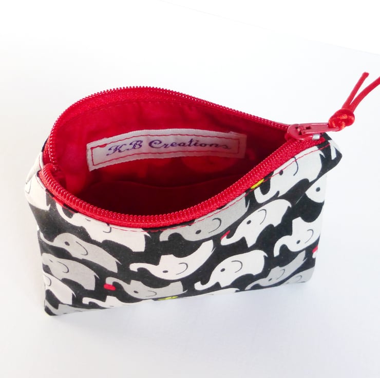 A coin purse made from 100% quilting weight cotton in a lovely elephant pattern in shades of grey and white with red and yellow highlights.