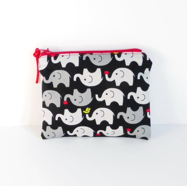 A coin purse made from 100% quilting weight cotton in a lovely elephant pattern in shades of grey and white with red and yellow highlights.